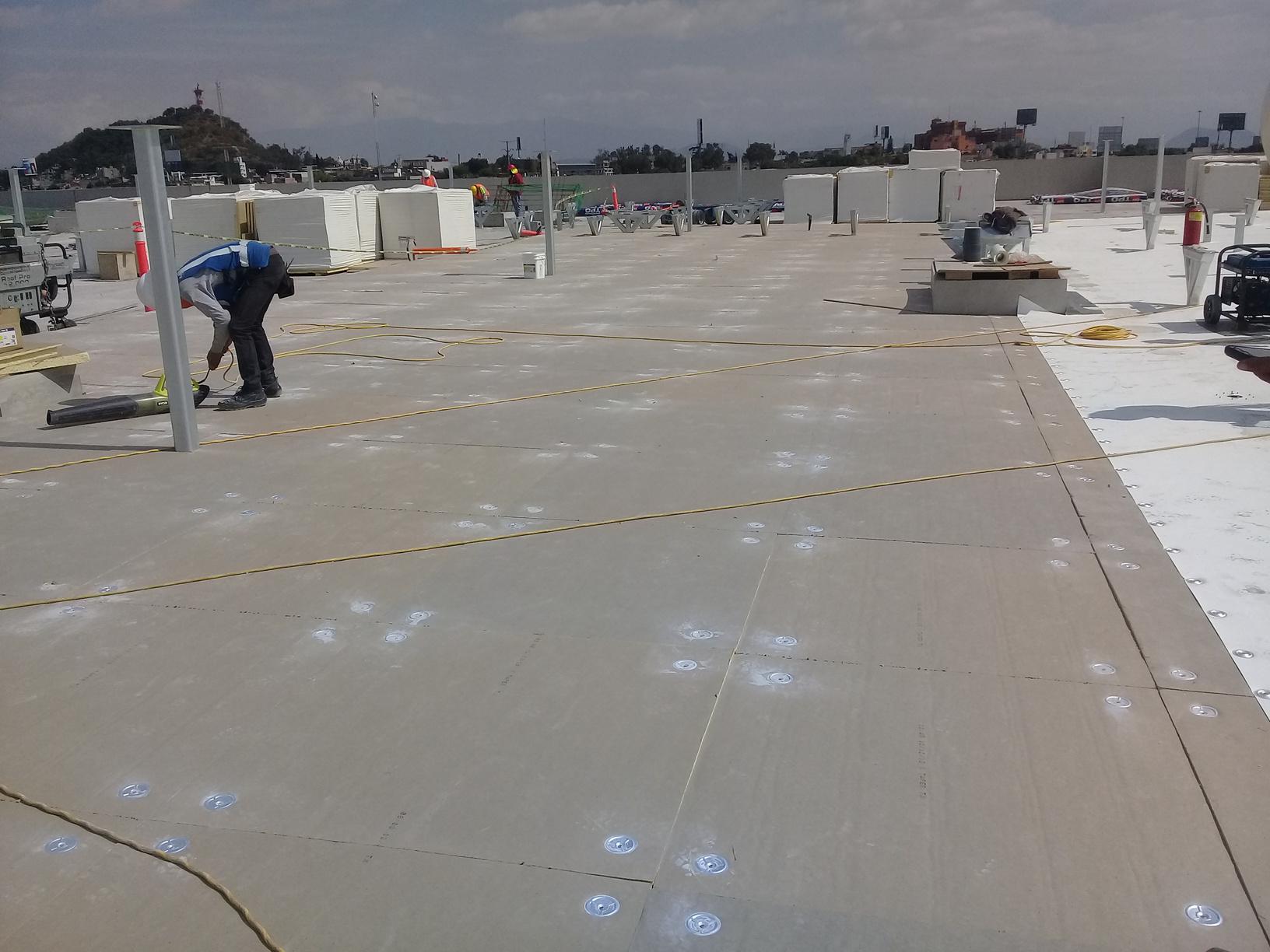 2. Instalación de Aislamiento Térmico: Colocamos una capa de aislamiento rígido (como Polyiso) que sirve como base y mejora la eficiencia energética del edificio.